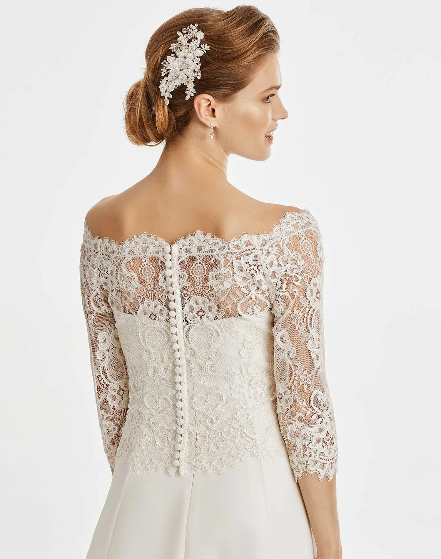 Boléro de mariée en dentelle ivoire à manches 3/4.
