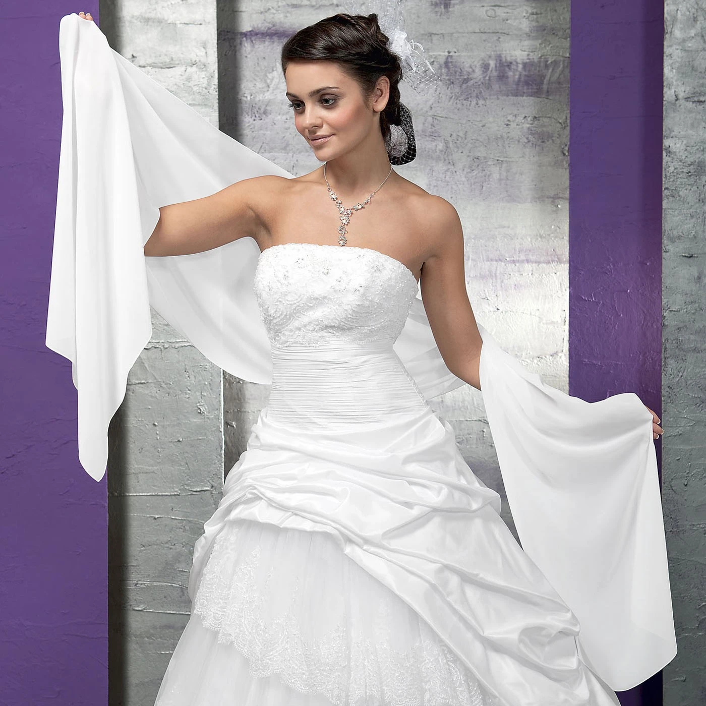 Châle de mariée en mousseline d’une taille de 50 cm x 230 cm.