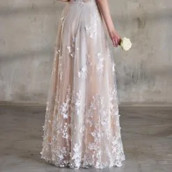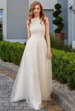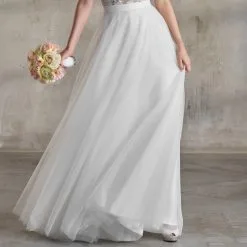 La jupe est composée d’une couches de satin recouverte d’une couche de tulle ivoire puis d’une dernière couche de tulle ivoire brodée d’étoiles.