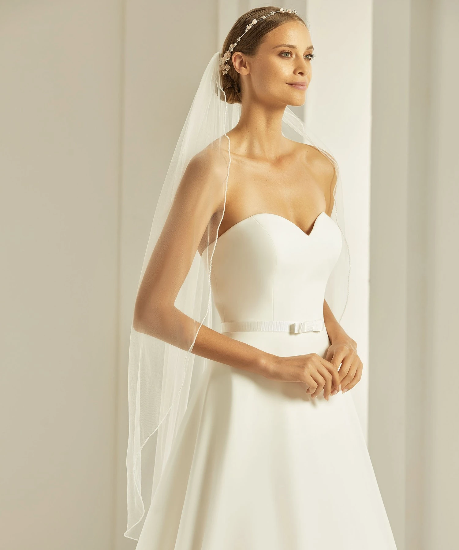 Voile de mariée mi-long en tulle souple.